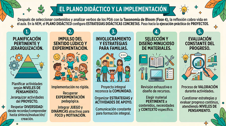 En la NEM, el plano didáctico es el espacio donde los Procesos de Desarrollo de Aprendizaje (PDA) contribuyen a configurar las estrategias didácticas concretas que aplicaremos con nuestros alumnos. Es el paso definitivo en el que las orientaciones analizadas nos dirigen hacia la ejecución práctica de los proyectos áulicos, escolares o comunitarios.